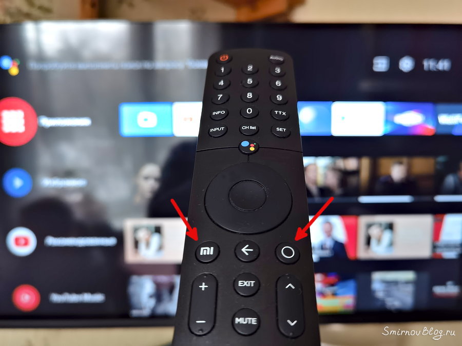 Чаще всего это комбинация логотипа «Mi» и круглой кнопки «O» (или кнопки «Домой»). Попробуйте поднести пульт вплотную к ТВ и зажать их на несколько секунд.