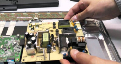- Не включается. Если техника не запускается с пульта — ПДУ сломан или поврежден фотоприемник на панели управления ТВ. Если не включается с кнопки — нужно паять контакты или менять клавишу.