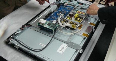 - Не показывает изображение, но воспроизводит звук в стандартном режиме. Вероятно, сгорела подсветка. Проверить это несложно — поднесите фонарик к экрану, проверьте, появятся ли контуры картинки. Если да — светодиоды подсветки необходимо заменить. Кроме того, проблема возникает из-за поломки инвертора, который регулирует яркость подсветки. Деталь также меняют.